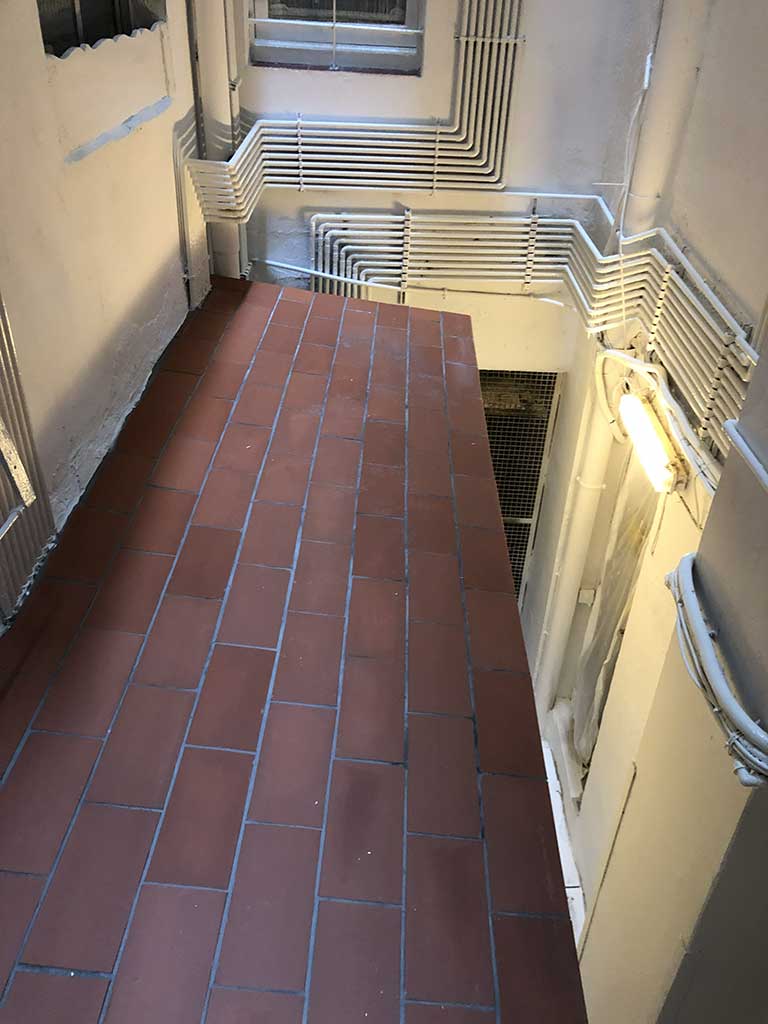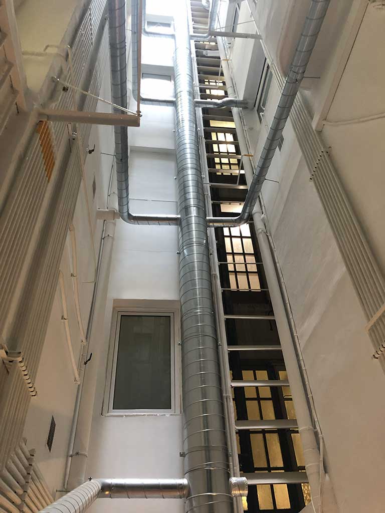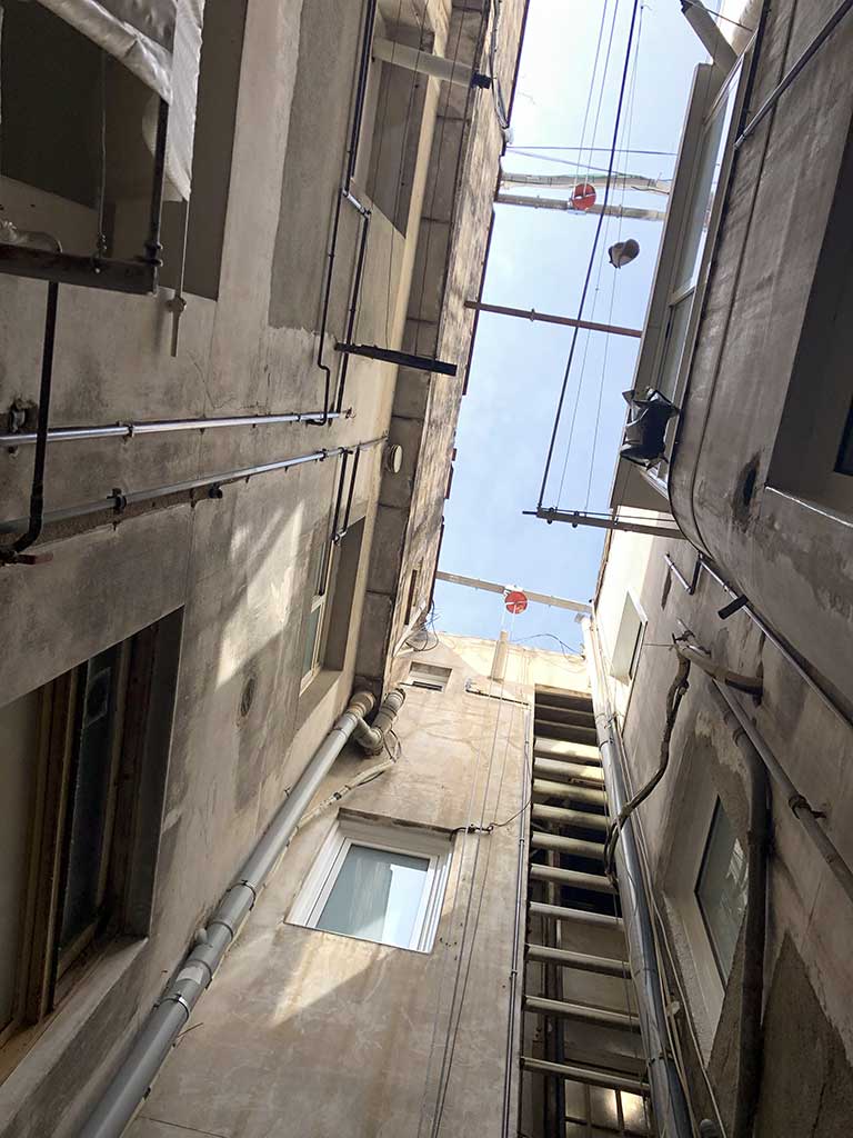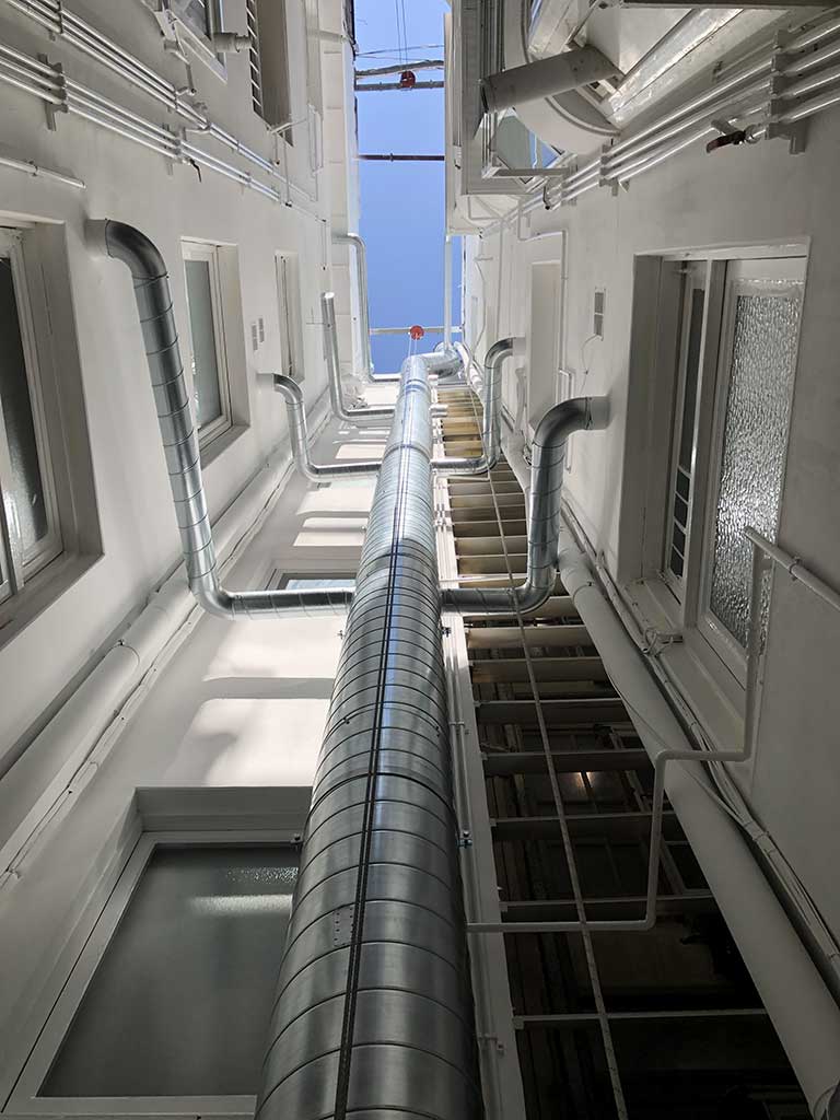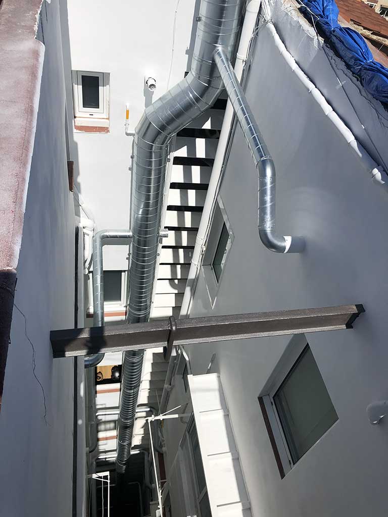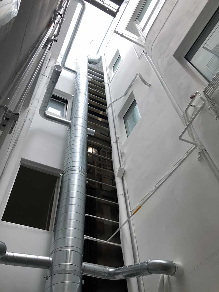 Rehabilitació de patis de llums i instal·lació de xemeneies per a l’extraccio de fums dels aparells de cocció de les cuines a un edifici plurifamiliar entre mitjeres, d’un edifici catalogat Nivell C.
